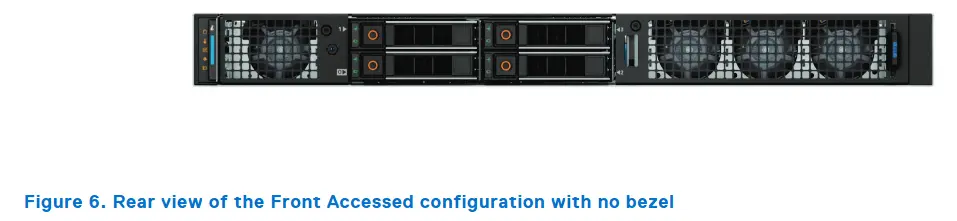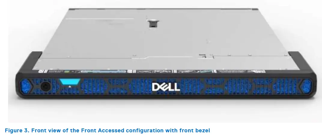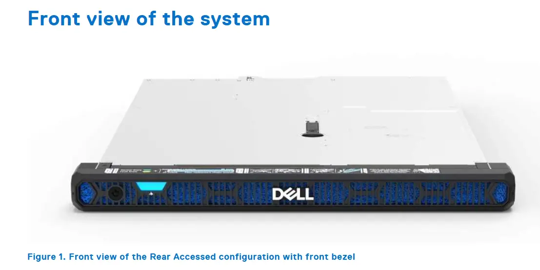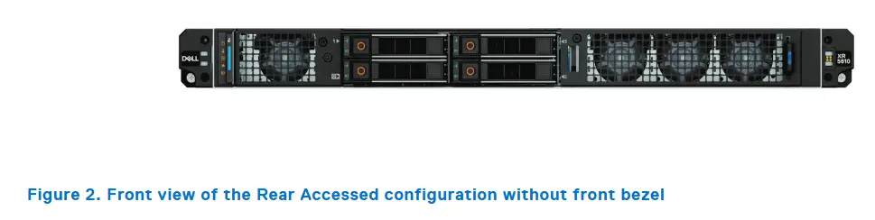 Mặt trước của Dell XR5610 được thiết kế theo phong cách tối giản với khay ổ cứng hot-swap nằm ở vị trí trung tâm. Các khe ổ được bố trí dễ nhận biết, thuận tiện cho việc thay thế ổ cứng nhanh chóng mà không cần tắt máy. Tùy theo cấu hình, máy hỗ trợ các tùy chọn 2.5” hoặc 3.5”, kết hợp các chuẩn lưu trữ như NVMe, SATA, SAS.