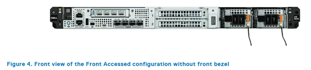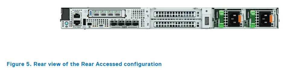 Phía sau XR5610 là nơi tập trung các cổng giao tiếp chính bao gồm: cổng mạng RJ45, cổng quản trị iDRAC riêng biệt, cổng USB, cổng serial và VGA. Một điểm đáng chú ý là thiết bị này hỗ trợ nguồn điện dự phòng (redundant PSU) để đảm bảo hoạt động liên tục, kể cả khi một nguồn gặp sự cố.