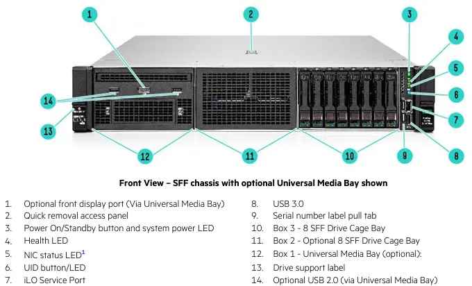 Mặt trước của HPE DL380 Gen10 Plus 8SFF được bố trí khoa học với 8 khay ổ cứng SFF (Small Form Factor) – lý tưởng cho doanh nghiệp cần mở rộng dung lượng lưu trữ mà không tốn quá nhiều không gian vật lý. Toàn bộ khay ổ được thiết kế hot-plug, cho phép thay thế ổ cứng trực tiếp mà không cần tắt máy, rất tiện lợi trong quá trình bảo trì hoặc nâng cấp.