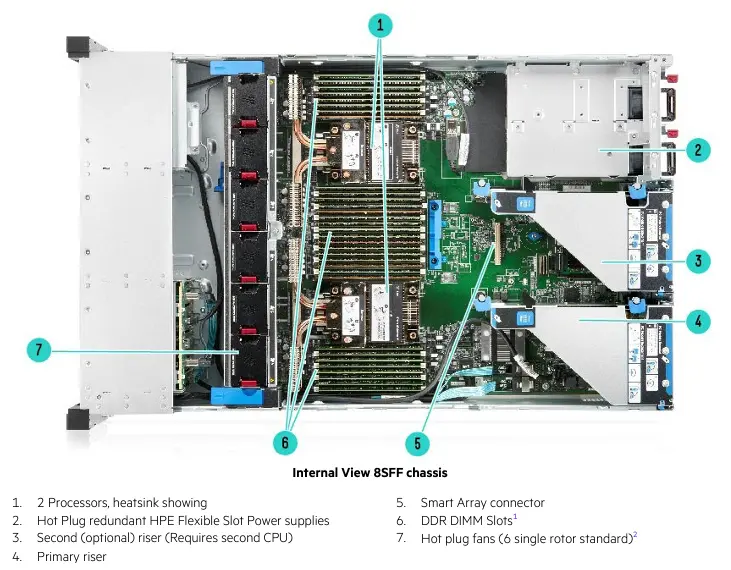 Khi mở nắp, bạn sẽ thấy bên trong của HPE DL380 Gen10 Plus 8SFF được bố trí cực kỳ hợp lý. Các khe cắm RAM, CPU, card mở rộng PCIe, và các quạt tản nhiệt đều được sắp xếp theo hướng dòng khí, giúp tối ưu luồng gió làm mát và tăng hiệu quả tản nhiệt.