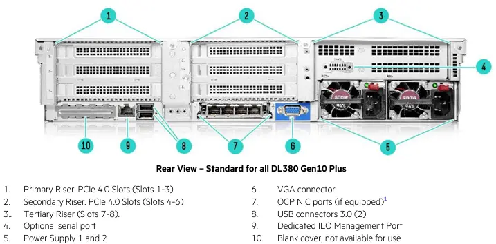 Mặt sau của máy chủ thể hiện rõ tính chuyên nghiệp trong thiết kế với hệ thống cổng kết nối đa dạng: từ cổng quản trị iLO chuyên dụng, các cổng USB, đến nhiều khe PCIe hỗ trợ card mạng tốc độ cao hoặc card RAID nâng cấp. Ngoài ra, hệ thống 2 nguồn điện dự phòng (redundant power supply) được bố trí ở hai bên, đảm bảo khả năng hoạt động liên tục ngay cả khi một nguồn gặp sự cố. Các khe thoát khí lớn phía sau cũng góp phần quan trọng trong việc giữ cho hệ thống luôn mát mẻ dù hoạt động với công suất cao.